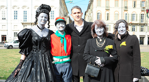Ai piedi della statua di Cavour, posta nel centro della piazza, quattro “statue virtuali”, rappresentate da quattro attrici della compagnia teatrale Artemuda poste su altrettanti basamenti, si sono animate, raccontando alle persone presenti la propria storia: quella di Virginia Oldoini, contessa di Castiglione, e di Rose Montmasson, donne che hanno operato in modo significativo nel Risorgimento, accanto a quelle di Rita Montagnana e di Teresa Noce, che nella prima metà del secolo scorso si sono spese per costruire l’Italia di oggi. In cerca delle loro tracce, un turista, anche lui impersonato da un attore, conduceva le persone presenti verso le statue parlanti: un intermezzo divertente e simpatico, che fungeva anche da collegamento tra i quattro monologhi.