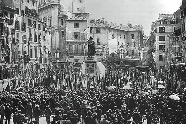 La maggior parte della popolazione italiana è cattolica, quindi il Pontefice ha una forte influenza sulle questioni interne al Paese. Fino al 1870 Roma è stata difesa dagli accordi diplomatici con la Francia. Quando il 20 settembre dello stesso anno i bersaglieri entrano a Roma attraverso una breccia aperta a cannonate nelle mura vaticane, il Papa Pio IX sceglie di non difendersi: militarmente sarebbe inutile e l’appoggio francese è venuto a mancare a causa della Guerra franco-prussiana, Napoleone III è caduto e la nuova III Repubblica Francese è profondamente laica. L’anno seguente il governo italiano emana la Legge delle Guarentigie, con cui stabilisce che l’interno delle mura vaticane, il palazzo di Castel Gandolfo e la basilica di S. Giovanni in Laterano restano di proprietà papale, mentre lo Stato italiano versa un indennizzo per i beni espropriati allo Stato della Chiesa, misero rispetto a quanto sottratto. Il Papa si dichiara prigioniero in Vaticano e ribadisce che potere politico e potere spirituale sono inseparabili. Nel 1874 Pio IX emana il Non expedit (dal latino «non è opportuno»), una disposizione in cui intima ai sudditi del Regno d’Italia di fede cattolica di astenersi dal partecipare alle elezioni e a tutta la vita politica del Paese. Proprio in questi anni, per provocazione contro la Santa Sede, il governo Crispi fa erigere a Roma la statua di Giordano Bruno (in copertina), considerato anticlericale, in Campo de’ Fiori, luogo dell’esecuzione del filosofo da parte del tribunale della Santa Inquisizione nel 1600, come simbolo del libero pensiero.