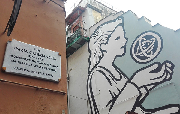 Via Ipazia d’Alessandria “simbolo di sapienza femminile e libertà di pensiero” ci fa arrampicare sui Quartieri Spagnoli fino al murale di MP5 che la ritrae con in mano l’astrolabio di sua invenzione, quasi a dialogare con la strada che a lei dedicata da lì si dipana.