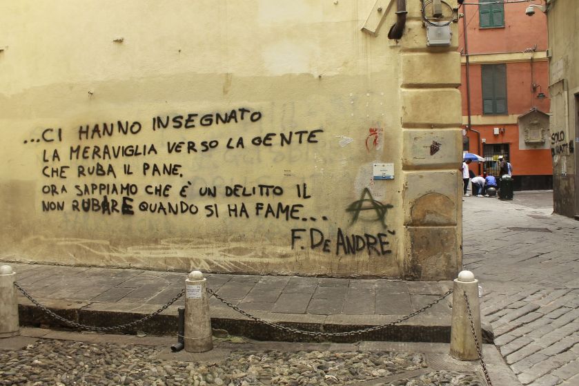 L’intera opera di Fabrizio De André è beffa del potere, dello Stato e delle sue leggi scritte, della presunzione di chi crede di avere sempre ragione. Re e gendarmi, professori e magistrati, sono figure per le quali il poeta genovese non ha mai avuto stima e raramente ha mostrato nei loro confronti il rispetto e la riverenza che questi si aspetterebbero. Si pensi, ad esempio, alla figura ridicola che fa Re Carlo quando, tornando glorioso dalla guerra contro i Mori, perde la dignità davanti a una ragazza di provincia; oppure si pensi a quanto è grottesco affidare all’ordine costituito «il furto d’amore» commesso dalla bellissima Bocca di Rosa.