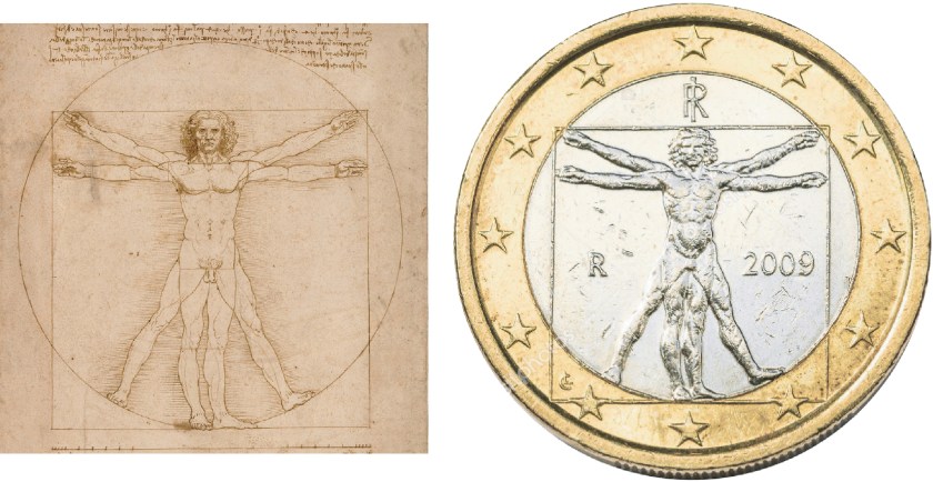 Far diventare moneta un disegno non è facile, perché il disegno è piatto mentre la moneta è a rilievo, dunque l’impresa di Cretara non si è limitata alla mera trasposizione da carta a metallo ma è stata una vera e propria reinvenzione dell’opera leonardesca. Il disegno di Leonardo, d’altro canto, a sua volta si rifà al trattato del grande architetto e scrittore romano Marco Vitruvio Pollione, la cui opera Leonardo aveva conosciuto grazie alla traduzione dal latino di Francesco di Giorgio Martini, e rappresenta la perfetta sintesi visiva dei concetti di proporzione ideale del corpo umano, considerati da Vitruvio alla base della progettazione di qualunque edificio. Come si può notare nel disegno, l’uomo è perfettamente inscritto nella figura perfetta del quadrato, che simboleggia la Terra, e del cerchio, che simboleggia il Cielo. Al centro del quadrato vi sono i genitali (maschili) e al centro del cerchio l’ombelico, come dire che la materia è centrata sulla figura maschile e la perfezione divina su ciò che lega l’essere umano alla madre, alla donna: una sintesi filosofica, geometrica, fisica e spirituale.