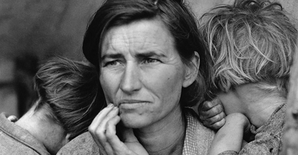La foto della donna povera che gira le campagne con i figli in cerca di un lavoro occasionale, opera di Dorothea Lange (in copertina, Migrant mother, particolare), è il simbolo dell’America rurale dei primi anni Trenta.