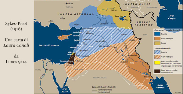 In un accordo segreto firmato a maggio del 1916 dal Ministro degli Esteri francese François Georges Picot e da quello inglese Mark Sykes, viene stabilito di creare in futuro una confederazione di Stati arabi sotto la guida di un capo arabo ma con un forte potere decisionale europeo per quanto riguarda la politica economica. Con questa promessa si spera in un’insurrezione araba filooccidentale che abbatta del tutto l’Impero Ottomano e acceleri la vittoria della guerra, insurrezione che però non si verifica.*Il diritto di ingerenza europea sarà diviso per zone: alla Russia spetterà il Nord-Est del Medio Oriente (attuali Armenia e Kurdistan turco), alla Francia la parte centrale e occidentale dell’area (attuali Siria e Libano) e alla Gran Bretagna le parti meridionali chiamate Mesopotamia, Transgiordania e Palestina (attuali Iraq, Giordania, Kuwait, Israele e territori occupati palestinesi).