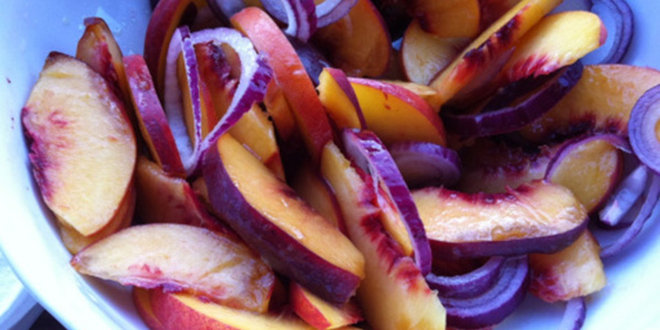 La preparazione è semplice e intuibile: si sbucciano e si affettano le pesche, si sbucciano e si affettano (sottili) le cipolle di Tropea, si condisce il tutto con poco olio buono e delicato.