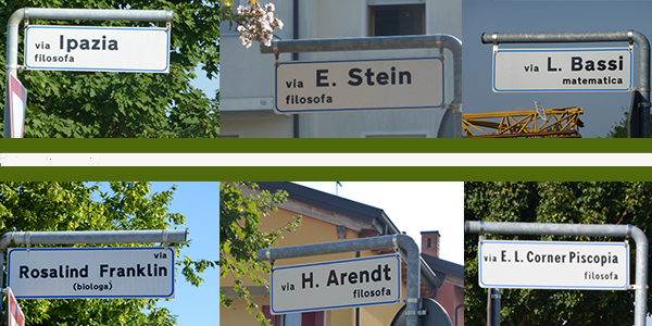 Dal punto di vista toponomastico San Donà di Piave, poco più di 42 mila abitanti, è avanti. Sì, avanti anche se è una parola un po’ retrò, perché ha un indice di femminilizzazione (rapporto strade maschili e femminili) del 12,34%, tra i più alti del nostro Paese. Con le sue 499 strade, 235 sono intitolate a uomini e 29 a donne. E la buona pratica si estende alla qualità dei soggetti scelti. L’Amministrazione con a capo Francesca Zaccariotto – con delibera pubblicata in data 2 marzo 2006 – ha portato alla pubblica memoria donne del calibro di Hannah Arendt, Ipazia, Edith Stein, Laura Bassi, Maria Cunitz, Elena Cornaro Piscopia, Maria Gaetana Agnesi, Madame Marie Curie e, unico comune in tutta Italia, Rosalind Franklin la scopritrice della doppia elica del DNA.