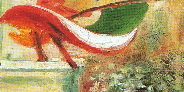 Giacomo Balla in Sventolio di bandiere attraverso il dinamismo nel tricolore italiano del bianco e del verde alternati al rosso esprime l’entusiasmo percepito in una manifestazione interventista.