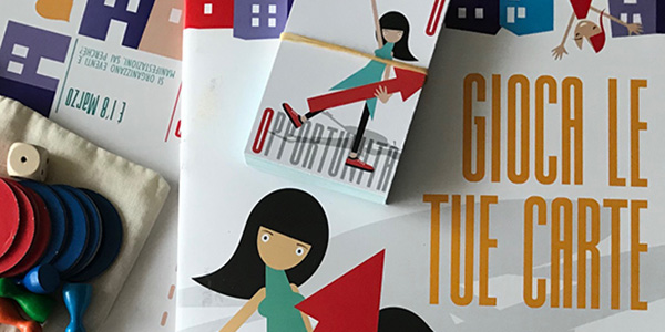 Come dicevo, le modalità di gioco sono molte e moltissimi sono gli stimoli che forniamo, sia attraverso l’opuscolo allegato sia attraverso gli approfondimenti tematici disponibili sul sito internet giocaletuecarte.it. Ad esempio su uno dei lati del cartellone, che rappresenta un percorso cittadino, le caselle, che sono funzionali allo svolgimento in positivo delle storie, rappresentano strade con nomi di donne importanti nell’ambito dei diritti femminili, del contrasto al razzismo e all’omofobia.