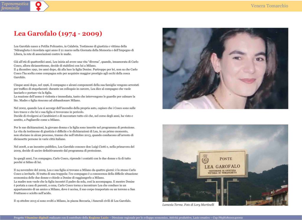 In molti luoghi e scuole sono state collocate targhe a Lea Garofalo e il 24 novembre prossimo, a Milano, a dieci anni dal suo assassinio, il coordinamento di Libera Milano ricorderà la forza coraggiosa di Lea con una fiaccolata, dai giardini di via Montello, in cui sarà posto un totem offerto dal Comune di Milano, fino al Cimitero monumentale e poi alla Fondazione Feltrinelli di via Pasubio.