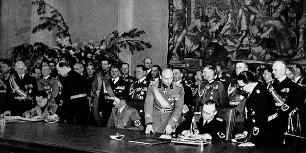 La Francia, terrorizzata dall’idea di una nuova guerra per il traumatico ricordo della precedente, stringe con la Germania un patto di non aggressione. Chamberlain, per continuare la politica di appeasement, chiede a Mussolini di intervenire come mediatore. I leader internazionali si riuniscono a Monaco di Baviera a settembre del 1938. Nella Conferenza di Monaco a Hitler vengono lasciate l’Austria e i Sudeti in nome della pace europea, a condizione che rinunci a nuove aggressioni. Mussolini, principale alleato della Germania nazista, ne esce come il mediatore che ha salvato l’Europa dalla guerra. Ad aprile del 1939 la Germania occupa tutta la Cecoslovacchia, dimostrando quanta poca considerazione abbia dei patti sanciti.