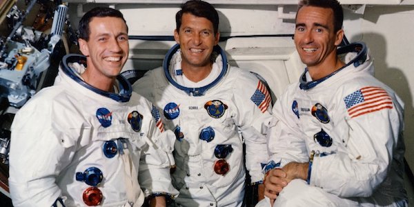 In copertina. L’equipaggio dell’Apollo-7. Da sinistra: Eisele, Schirra, Cunningham (Nasa credit).