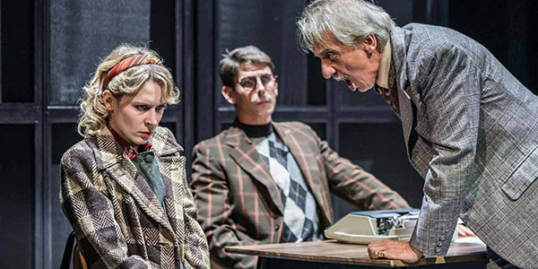 Lo spettacolo teatrale si avvale dell’adattamento di Letizia Russo ed è interpretato nei ruoli principali da Elena Rodonicich e Peppino Mazzotta (Blorna), con la affiatata e convincente compagnia del Teatro Stabile del Friuli Venezia Giulia, per la regia di Franco Però. La scena è essenziale, ma assai funzionale: delle pareti verticali trasparenti, con porte apribili e alcuni semplici arredi, che rappresentano vari ambienti, consentendo più azioni contemporanee. Al centro gli elementi minimi di una stanza nella sede della polizia: un tavolo, delle sedie, un telefono. Lo sviluppo della vicenda segue rigorosamente quello del romanzo, addirittura con le stesse battute; si distaccano però alcuni espedienti teatrali: Katharina spesso racconta di sé in una sorta di monologo, il giornale senza nome qui diventa chiaramente “Bildzeitung”, mentre il finale si svolge in carcere con un incontro fra Blorna (che ha perso prestigio, è sporco e trasandato) e la ragazza ormai condannata, pur con tutte le attenuanti. In questo spettacolo, che non perde nulla del vigore del testo, sono ben caratterizzati i vari ruoli; mi è molto piaciuto ad esempio il vecchio commissario, insinuante ma non sgarbato, cauto e perspicace. Tötges acquista più evidenza rispetto al romanzo, e si calca la mano sui suoi comportamenti abietti, da sciacallo che rimesta nel fango, insultando persone deboli e innocenti, e falsificando la realtà dei fatti. Molto bravo Mazzotta, assai conosciuto dal pubblico televisivo per il suo ruolo come Giuseppe Fazio, a fianco del commissario Montalbano. Non lo avevo mai visto in teatro, ma sapevo della sua capacità di entrare nei ruoli più vari, mutando voce e atteggiamento, con notevoli doti di interprete, come accade qui: all’inizio professionista distinto e pacato, poi nervoso e impaziente, infine uomo distrutto nel fisico e nel morale, dopo la crisi economica precipitata su di lui e la moglie a seguito del coinvolgimento nel caso di Katharina, per la quale ha sempre provato più di un semplice affetto. Elena Rodonicich, volto noto in televisione e al cinema, ha la grazia e la decisione di Katharina, precisa, attenta, governante perfetta che ha reso un paradiso l’abitazione e la vita dei Blorna. Ma con altrettanta determinazione si procura la pistola, la nasconde, tende la trappola al giornalista e, sentendosi toccare e apostrofare con volgari richieste (quel bum-bum che diventa un doppio senso), non può fare altro che fare anche lei bum-bum. Ha girato a lungo, per ore, per “trovare” il rimorso, ma non l’ha trovato, e va a costituirsi.