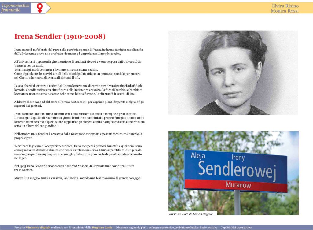 Mi è tornata così alla mente una storia di speranza, di altruismo, di amore, nel buio più pesto per l’umanità, la storia di una giovane donna coraggiosa, che si è spesa con ogni mezzo a sua disposizione e con tutte le sue forze per salvare tanti di quei bambini e bambine da una fine crudele e senza senso, una donna che non ha avuto per un attimo esitazione alcuna in ciò che faceva, nemmeno a costo di perdere la sua stessa vita. Mi sono detta che donne così val la pena di cercare, seguire, imitare. Se volessi, infatti, stilare un elenco di donne che assurgano a modelli da seguire, sicuramente nelle prime posizioni collocherei il nome di questa donna, Irena Krzyżanowska Sendler. Nata il 15 febbraio 1910 in una famiglia cattolica di orientamento socialista, il gene dell’altruismo e del rispetto dei diritti umani Irena l’ha sin dall’infanzia, quando cresce con un padre medico che muore di tifo contratto da pazienti, per lo più ebrei, che i suoi colleghi si erano rifiutati di curare. Irena riceve poi aiuto per gli studi dai componenti della comunità ebraica, riconoscenti per le cure ricevute. Lei stessa all’università si oppone alla ghettizzazione delle e degli studenti ebrei e viene espulsa per tre anni. Trasferitasi a Varsavia nel 1939, quando già Hitler ha occupato militarmente la Polonia, Irena diviene assistente sociale e si adopera incessantemente per aiutare numerose famiglie ebree a fuggire, fornendo loro documenti falsi. Allo scoppio della Seconda guerra mondiale la giovane ha ventinove anni e lavora come assistente sociale per l’amministrazione comunale, e, con il supporto del direttore del dipartimento (che per questo verrà deportato ad Auschwitz), presta soccorso alle e agli Ebrei, oggetto di ogni tipo di discriminazione da parte dell’autorità nazista occupante.