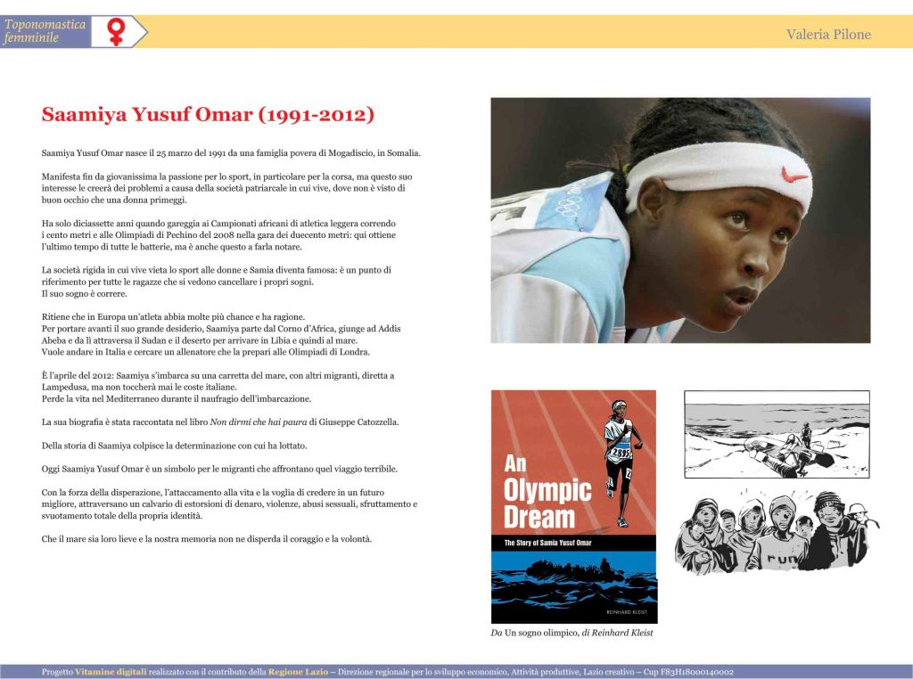 A Samia la nostra Associazione di Toponomastica femminile ha dedicato un pannello della mostra Le viaggiatrici e la sua storia è presente nel viale delle Giuste alla Libera Università di Alcatraz, un percorso di circa 1500 metri lungo il quale sono state posizionate le sculture dedicate a 40 donne meritevoli del titolo di Giuste. Nella mia scuola, l’I.I.S. “Vincenzo Benini” di Melegnano, le abbiamo intitolato l’aula della 5B Liceo delle Scienze umane, nell’anno scolastico 2017/2018, dopo un percorso di approfondimento della sua storia attraverso la lettura del libro di Giuseppe Catozzella, autore che abbiamo avuto il piacere di ospitare a Melegnano, con la collaborazione del Comune, ad ottobre 2019, dal quale abbiamo ascoltato in modo diretto il suo incontro con la sorella dell’atleta. A Samia affidiamo tutte le donne che hanno vissuto e vivono l’orrore del Viaggio: alcune ce la fanno, tante altre affollano il cimitero sottomarino del Mare Nostrum. Che il mare sia loro lieve e la nostra memoria non ne disperda il coraggio e la forza di volontà.