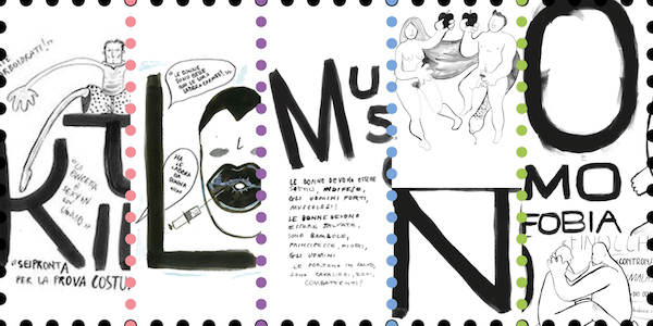 Siamo a metà luglio, la scuola è finita da un bel po’ e le famiglie degli/lle studenti se ne sono andate – o, meglio, per la maggior parte se ne sono restate – in vacanza. Dunque le classi sono scomparse come sempre ma, quest’anno, ho l’impressione che siano scomparse di più. La distanza estiva ora è innaturale, perché non è bilanciata da una recente e lunga vicinanza. Non sembra quindi una salutare liberazione, un riprendere fiato, ma il proseguimento di un rapporto artefatto, innaturale. Non insisterò con le querimonie da dad, ché troppo ne ho scritto, ed è ancora presto per meditare sul futuro anno scolastico perché le notizie su date, orari e modalità sono ancora poco definite. Meglio dunque passare alla presentazione dei dieci elaborati di questa puntata – che, lo ricordo, prende le mosse dall’abbecedario di Vitaminevaganti scritto da Graziella Priulla e illustrato da Marika Banci – fatti da ragazze e ragazzi di sei classi del Liceo scientifico Primo Levi di Roma di cui sono stato insegnante di Disegno e storia dell’arte. Le cinque lettere sono: K come Kilo, L come Labbra, M come Muscoli, N come Nudità, O come Omofobia. Non sono lettere qualsiasi; sembrano messe lì apposta, una in fila all’altra, per provocare riflessioni, anche nel senso fisico di riflettersi, specchiarsi e guardarsi sopra e sotto la pelle. La forma fisica, la bellezza, la prestanza, la capacità o la difficoltà di attrarre, l’intimità, la sensualità, l’eros sembrano diventare, nell’adolescenza, altrettante bombe che prima o poi esplodono. Tutte e cinque le lettere, e quindi le parole e ciò che esse comunicano, sono pane quotidiano per le ragazze e i ragazzi che si sono cimentate/i nel tradurle in segni e nel bilanciare i significati in simboli. Come sempre i risultati (oserei dire, infrangendo la regola autoimposta di scrivere in italiano, le performance, come ormai si usa definire tutto: dall’interrogazione di matematica all’aspetto fisico dell’amore) sono stati tanti e diversissimi, e come nelle altre due puntate di questa rassegna hanno richiesto un lavoro di selezione ingrato perché, a parte pochissime, tutte le immagini rispecchiavano comunque un vissuto. Data la scarsissima vicinanza avuta con le classi quest’anno, non ho idea precisa di come, per esempio, l’omosessualità e l’omofobia siano vissute da ognuna/o di loro, ma di certo non è un concetto neutro per nessuna/o. A scuola, si sa, si vede e si sente di tutto, dall’insulto (inconsapevolmente?) omofobico alla necessità di affrontare una propria natura difforme dalle leggi del mercato e della “morale comune”; soprattutto, la difficoltà di rapportare il proprio essere e il proprio corpo ai modelli egemoni imposti dalla società e la frustrazione che ne consegue, passaggio obbligato per una presa di coscienza e un’auspicabile quanto difficile liberazione. Ringrazio come sempre tutte e tutti. Repetita iuvant: le immagini qui riprodotte non sono necessariamente le più belle, sono quelle che a mio avviso comunicano meglio. La bellezza è una faccenda complicata e forse sopravvalutata. In questa sede, preferisco la funzione.