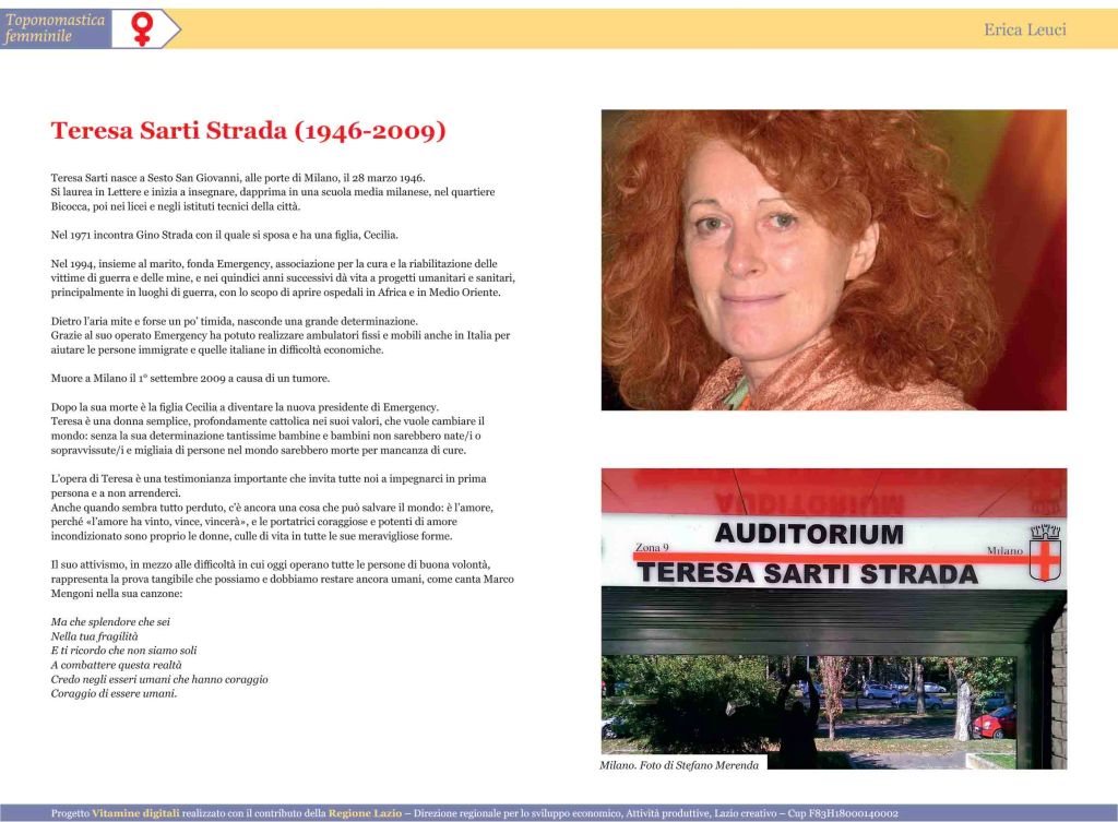 Undici lunghe primavere sono passate da quando Teresa Sarti Strada è venuta a mancare al nostro amore e a quello del marito, Luigi Strada, detto “Gino”, con il quale ha dato vita a Emergency, oltre che alla loro creatura Cecilia. Chi l’ha conosciuta, la ricorda come una donna che fra le tante cose, era soprattutto una donna di pace. Non a caso il centro di cardiochirurgia inaugurato assieme al marito nel maggio del 2007 in Sudan si chiama “Salam”, ossia pace in arabo. Un concetto di pace molto concreto che si colloca e si sostiene su un posizionamento, uno sguardo e ancora un progetto visionario in nome di diritti che dovrebbero essere fondamentali e che ancora oggi rimarcano il confine tra la civiltà e la barbarie: il diritto alla salute, in primis, per ogni singolo essere umano al mondo, senza discriminazione alcuna. Nata a Sesto San Giovanni il 28 marzo 1946, laureata in Lettere Moderne all’Università Cattolica di Milano, con una tesi sulla didattica della storia, inizia a insegnare nella scuola media statale Giolli, nel quartiere Bicocca di Milano, periferia in cui vive un sottoproletariato costituito in buona parte da immigrati provenienti dal sud del Paese, luogo in cui inizia a familiarizzare con le discriminazioni e le ingiustizie sociali, economiche e culturali. Nel 1979 sposa Gino Strada, studente di medicina e militante del movimento studentesco, il quale dopo la laurea inizierà a lavorare per la Croce Rossa. Ed è proprio al marito che Teresa manifesta la volontà di creare un presidio medico in zone di guerra. Da quell’idea nel 1994 nasce Emergency, di cui Teresa è la prima presidente. Continua a insegnare nelle scuole medie superiori, per poi trovarsi costretta ad andare in pensione perché il ruolo che ricopre è molto impegnativo. Tuttavia non smette mai di insegnare attraverso il suo esempio: dapprima si fa promotrice della campagna per la messa al bando delle mine anti-persona, di cui l’Italia è produttrice ed esportatrice nel mondo, poi organizza esposizioni di lastre e fotografie scattate da medici e paramedici nei luoghi di guerra per accrescere la consapevolezza dell’opinione pubblica sugli orrori della guerra, e le diffonde nelle scuole, luogo che ella ritiene essere il punto di partenza per migliorare il mondo. Alla stregua di questo progetto si inserisce il fumetto, protagonista Lupo Alberto, il cui motto significativo è «Sopra la guerra c’è chi campa, sotto la guerra c’è chi crepa». Poi ancora, firma le campagne volte a diffondere una cultura della pace in Uno straccio di Pace (2001) e Fuori l’Italia dalla guerra (2002), sostenendo l’idea che la pace non si costruisca solo manifestando contro la guerra, ma fornendo prospettive reali alle persone, garantendo a tutti in primo luogo un tetto sicuro e un lavoro, e con essi il diritto alla salute. E questo si può attuare, portando la sanità di eccellenza nei luoghi più remoti del mondo, quelli più vessati dalla povertà e dalle guerre. Un’idea che si concretizza a Kartum, nei cui ospedali vengono garantite cure gratuite per donne e bambini, in Africa come in Afghanistan, e in altri sedici paesi. Garantire i diritti praticandoli, questo il modo di fare politica di Emergency – una politica neutra, quasi una contraddizione in termini, una posizione non caso e non poche volte invisa a destra e sinistra – che però dal 1994 a oggi ha curato dieci milioni di persone. Numeri che per il peso specifico dell’opera che portano in sé, schiacciano quelli ancora più esorbitanti che si spendono – che anche l’Italia spende – per l’acquisto delle vili armi. Chi conosceva in prima persona Teresa Sarti, dicevo, ricorda le sue parole «La guerra è scandalo, e dunque intollerabile. Ogni vittima ci riguarda, tutti, sempre», parole che fanno eco alla penna morantiana che nel suo capolavoro denunciava la Storia, con la esse maiuscola, quella dei vincitori e degli oppressori a discapito dei più deboli, «Uno scandalo che dura da diecimila anni».