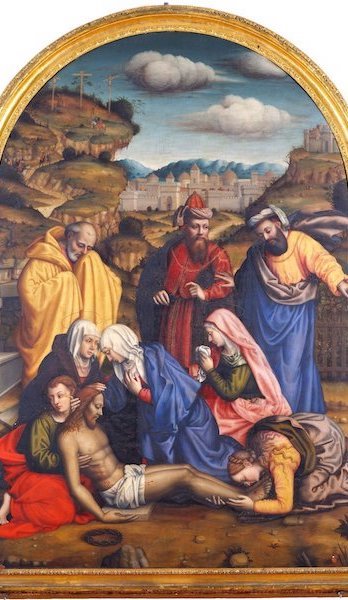 Nel Compianto su Cristo morto tre donne inginocchiate accanto a Maria la confortano e al centro è Nicodemo, in piedi, riccamente vestito. Il corpo del Cristo è semisdraiato sopra una pietra, mentre Maddalena, inginocchiata e di profilo, gli bacia i piedi. Lo sfondo paesaggistico è ampio e dettagliato: al centro si vede la città di Gerusalemme, cinta da solide mura, fuori dalle mura una donna con un bimbo è intenta a raccogliere verdura e tra le colline si distingue il colle del Golgota, con le tre croci ormai vuote, mentre diversi personaggi percorrono il sentiero che porta in cima, a piedi o a cavallo.