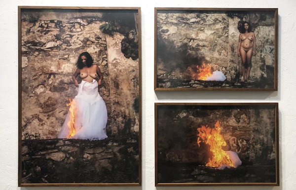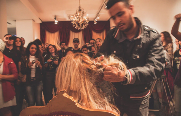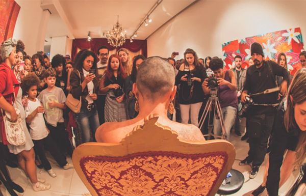 Avendo fatto “scuola” in strada con i graffiti, l’interazione con il pubblico non mi spaventa, anzi, la ricerco. Una persona che interagisce con me dà qualcosa in più al mio lavoro, lo trasforma in altro. Per esempio, nella performance Ruptura (Rottura), ero seduta al centro della sala che ospitava la mia mostra, ho dato un paio di forbici al pubblico e ogni persona presente è venuta a tagliarmi una ciocca di capelli, fino a che non sono rimasta senza. L’atto di farmi recidere i lunghi capelli biondi deriva dal fatto che fin da bambina mia madre negava le mie radici afro. Mi allisciava i capelli, li tingeva di biondo dicendomi che così sarei sembrata una donna ricca, ma in realtà quello che voleva era farmi sembrare una persona bianca. Infatti, nella mia famiglia solo mio padre era nero, ma non l’avevo mai conosciuto. Mia madre mi diceva che avevo una carnagione più scura perché i miei antenati erano indigeni della foresta, un popolo socialmente più accettabile di quello nero. In verità si cercava di nascondere che ero di discendenza afro perché la mia famiglia era molto razzista, sono stata cresciuta con un pensiero razzista. Per questo mi si allisciavano e mi si tingevano di biondo i capelli. Essendo mulatta, il mio fenotipo può essere tanto bianco quanto nero e in questo modo avevo più possibilità di sembrare bianca. Quando ho scoperto la verità, ho fatto ricerche sulle mie origini e ho voluto rompere con questo processo d’oppressione che mi aveva impedito di entrare in contatto con la mia vera cultura. Per questo ho chiesto alle persone di tagliarmi i capelli, in modo da liberarmi di questo peso e lasciare che i miei ricci neri crescessero naturalmente.