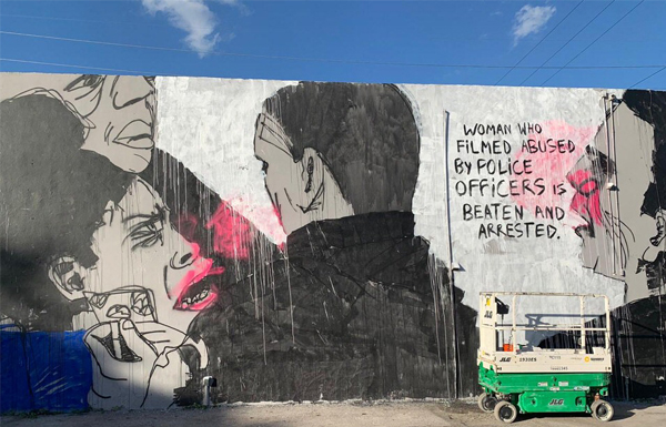 Quando ho incontrato Panmela era l’ottobre del 2019 e doveva partire a breve per l’Art Basel, la fiera di arte contemporanea che si tiene annualmente a Miami. Era stata invitata per dipingere un murale a Wynwood, il quartiere della street art. Il soggetto raffigurato faceva parte del progetto #RetratosRelatos [Ritratti di storie] dove l’artista raffigura volti di donne, una volta raccontata la loro storia. Panmela decise di rappresentare una fotografia pubblicata nel quotidiano nazionale brasiliano O Globo. Nella favela di Rocinha a Rio de Janeiro, una donna nera che aveva filmato gli abusi della polizia nei confronti di un ragazzo senza documenti era stata aggredita e arrestata dalla polizia stessa. Il murale di Panmela fu cancellato dalle autorità locali il giorno seguente.