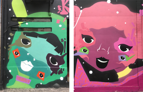 I personaggi che rappresento sono senza sesso e vivono in universi differenti e aleatori. Non hanno un significato preciso, mi rivedo molto in loro… per esempio adesso sto affrontando una fase mega colorata! Penso che ogni artista si riveda nei propri disegni. Da quando ho iniziato a fare graffiti ho sempre ritratto personaggi, non ho mai fatto lettering. Mi piace disegnare su pareti grandi, realizzare delle produzioni che rimangano lì, in modo tale che le persone possano avere una relazione con i miei murales.