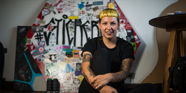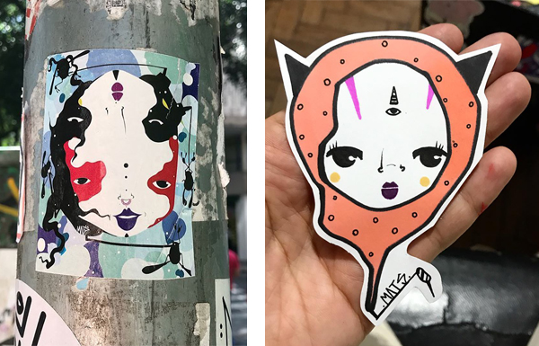 Tra le iniziative artistiche a cui ho dato vita c’è lo sticker up, un evento dove gli adesivi sono i protagonisti. Era un momento in cui non stavo facendo niente e allora mi sono detta: «facciamo qualcosa!». Ho chiamato alcune amiche e insieme abbiamo creato questa iniziativa. A San Paolo gli adesivi sono molto diffusi, vengono scambiati tra le persone e incollati in giro. Credo che noi abbiamo dato solo più forza a un movimento che ne aveva bisogno. Durante gli eventi di sticker up suoniamo sempre della musica e inseriamo delle donne nel palinsestoe di volta in volta un artista, uomo o donna, realizza un disegno specifico per l’adesivo che rappresenterà il festival.