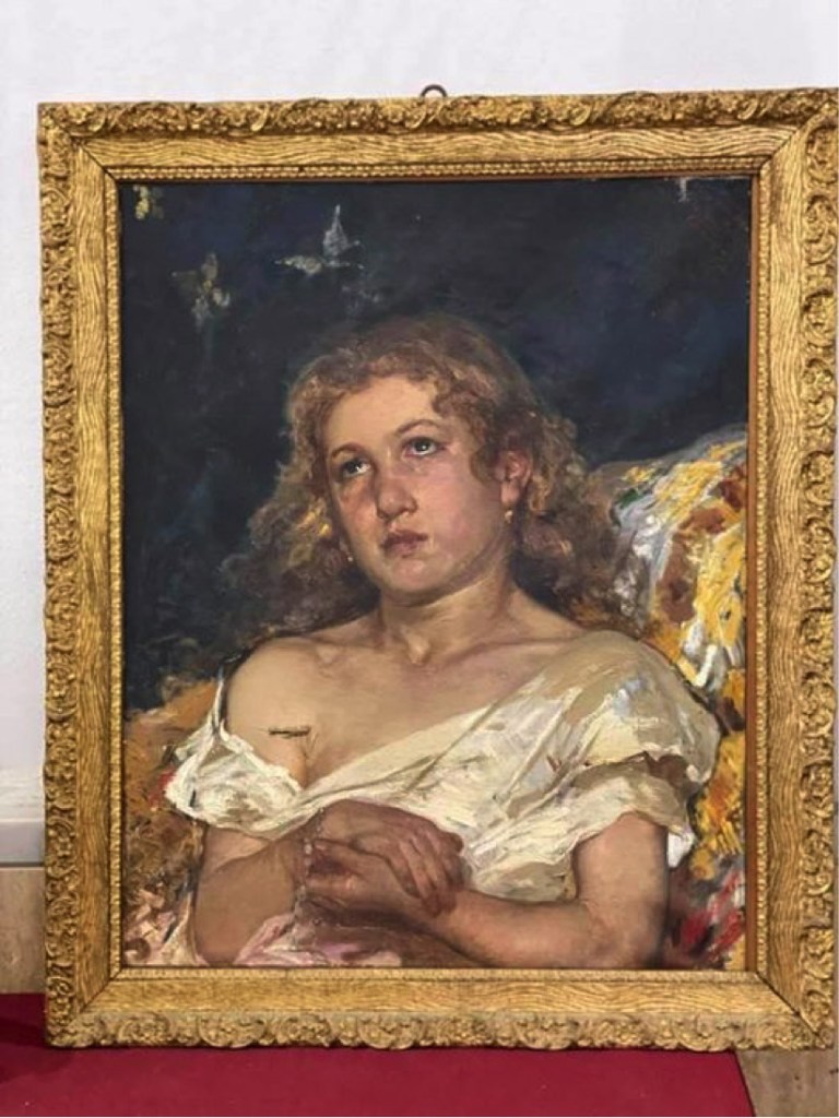 «La mia bisnonna nata a Giarre in provincia di Catania nel 1862 era una grande donna. Una pittrice compiuta, ricca di talento e d’immaginazione, ma piccola di statura. Per dipingere grandi tele utilizzava un tavolo, su cui si arrampicava sollevando le pesanti gonne e dipingeva come una furia. Ne sono fiera, soprattutto oggi che ho trovato casualmente un suo quadro in rete: Fanciulla Addormentata del 1894.» Il pezzo non è firmato, ma si presume sia dell’architetta Isabella Sacco, pronipote dell’artista, esperta d’arte e gallerista, come sembrò confermare nel 2011, data del centenario della morte del pittore, quando l’Accademia Zelantea di Acireale la invitò, gli dedicò una mostra e lo ricordò attraverso qualificati interventi nel corso di un convegno che divenne anche un volume dal titolo: Giuseppe Sciuti nell’anniversario della morte, stampato ad Acireale. La data di nascita data dalla pronipote non appare esatta ma influenza alcune case d’asta trovate nel web.