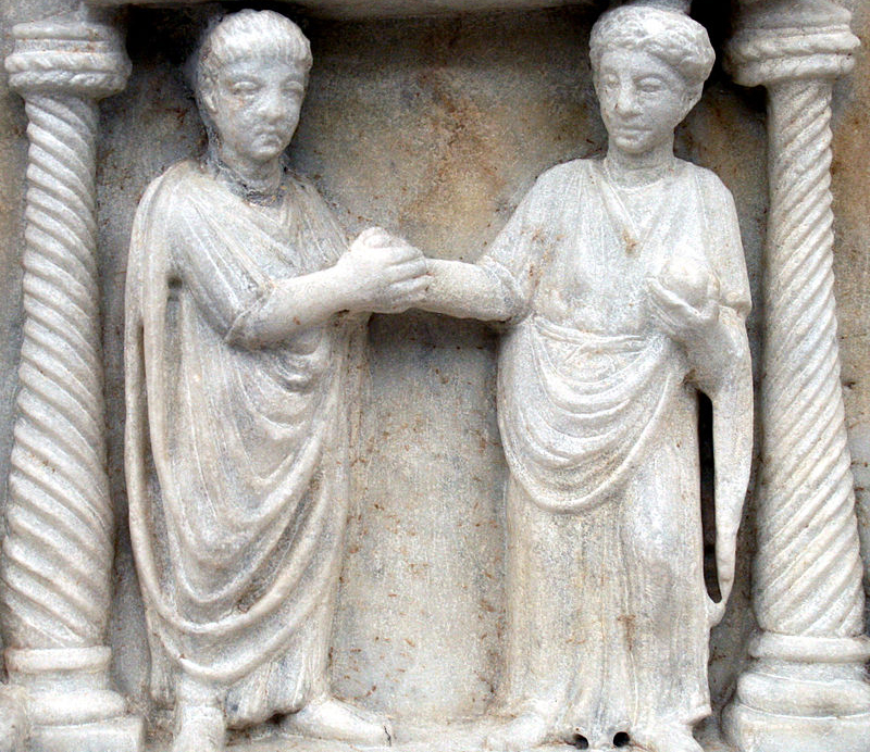Nella Roma di una volta, le spose indossavano una tunica bianca, stretta in vita da una fascia di lana con un nodo particolare contro il malocchio che solo lo sposo poteva sciogliere la prima notte. Furono le giovani romane a inaugurare la tradizione del velo, che era rosso rubino, arancione o giallo, trattenuto da una coroncina di mirto e fiori d’arancio. Portavano una collana e ai piedi ricchi calzari dello stesso colore dell’abito. I capelli erano divisi in sei trecce, raccolte fin dalla sera prima in una reticella rossa.