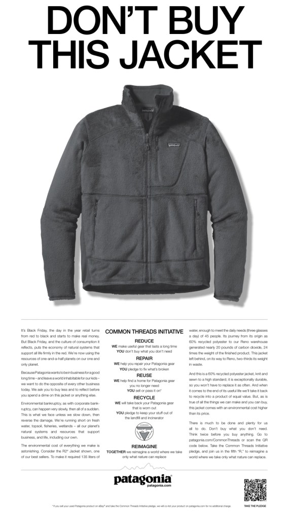 Per ora l’accesso ai vestiti in affitto non è diffuso in tutto il mondo, ma i negozi di seconda mano lo sono. Anche in questo caso ci sono negozi che commercializzano marche e prezzi differenti offrendo una scelta abbastanza ampia. È possibile acquistare sia ai mercatini sia in negozi veri e propri, che commercializzano da capi di basso livello fino al vestiario cosiddetto vintage, di maggior valore. Lo scopo delle grandi compagnie del fast fashion è ovviamente vendere il più possibile, usando un marketing accattivante e proponendo collezioni che si susseguono a prezzi stracciati e sconti che incentivano un ciclo consumistico. In controtendenza, il marchio Patagonia durante un Black Friday del 2011 ha pubblicato sul “New York Times” una pubblicità di denuncia del consumismo. Una prima osservazione interessante suggerita dall’azienda è la distinzione tra consumatori/consumatrici e proprietari/e: la prima categoria compra senza dare peso alla qualità del prodotto, al meccanismo produttivo, alle conseguenze; la seconda è invece consapevole della responsabilità che si assume con l’acquisto.
