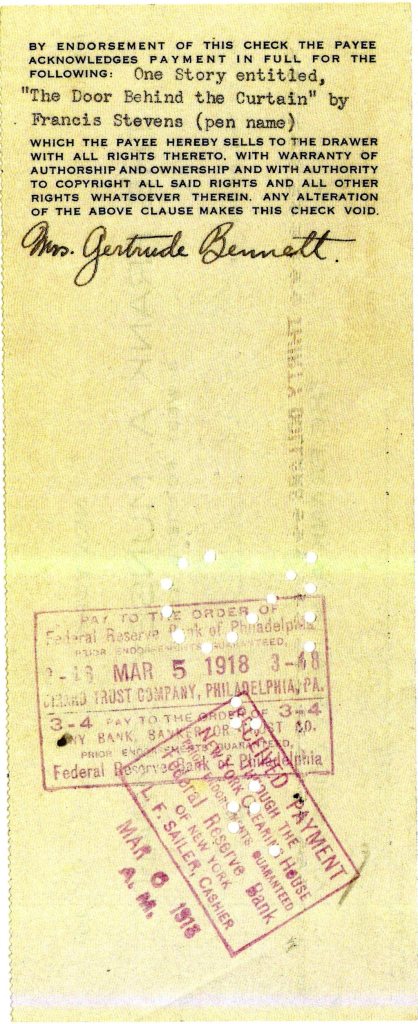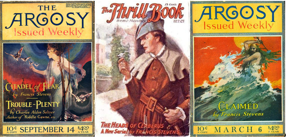 Seguono nel 1918 i racconti Friend Island e Behind the courtain e i romanzi Citadel of fear e The Labirinth; nel 1919 i racconti Unseen-unfeared e The Elf-Trap e i romanzi The heads of Cerberus e Avalon; nel 1920 i romanzi Claimed e Serapion; pubblicato nel 1923 ma forse scritto in precedenza il racconto Sunfire. I pulp magazine che accolgono le opere di Francis Stevens sono principalmente “All-Story Weekly” e “Argosy”, che nel 1920, in seguito a fusione, danno vita a “Argosy Weekly”: sul «nuovo autore» si apre un dibattito appassionato tra lettori e cultori del genere pulp, che porta inizialmente a identificarlo con Abraham Merritt, riconosciuto maestro dark fantasy. Il mistero sarà definitivamente svelato soltanto nel 1952, grazie alla ristampa di The heads of Cerberus.