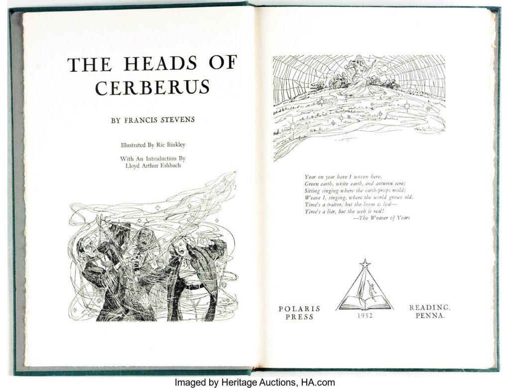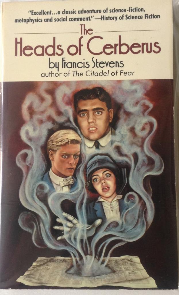 The heads of Cerberus (Le teste di Cerbero, titolo italiano Le teste del Cerbero), insieme con Citadel of fear (vicenda incentrata sulla riscoperta di una antica città atzeca e di un inquietante mondo perduto, altro rispetto a quello occidentale contemporaneo) e Claimed (che ispira i miti del grande antico Cthulhu di Lovecraft), rappresenta una delle opere meglio riuscite di Gertrude ed è anche l’unica pienamente ascrivibile al genere science fiction. Il romanzo è pubblicato con il consueto pen name di Francis Stevens dalla rivista pulp “The Thrill Book”, specializzata in «different stories». Ampie le concessioni al genere mainstream, a partire dai caratteri dei tre protagonisti: Robert ‘Bobby’ Drayton, giovane avvocato estromesso dall’ordine a causa di una accusa infamante e ingiusta, dotato di intelligenza e lealtà; Terence ‘Terry’ Trenmore, ricco collezionista di origine irlandese, dalla statura gigantesca e dal cuore generoso; Viola Trenmore, sorella diciassettenne di questo, bella e desiderabile ma anche coraggiosa e ribelle (va da sé che Robert se ne innamorerà e sarà ricambiato).