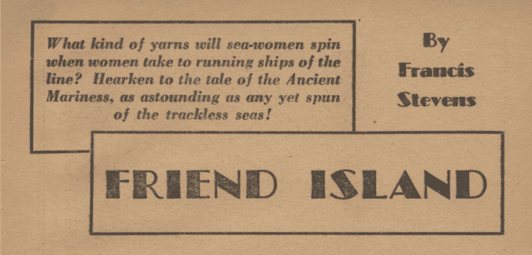 «Quali trame narreranno le marinaie quando saranno le donne a guidare le navi di linea? Ascolta il racconto della Vecchia Marinaia, profondo e sconosciuto quanto i mari inviolati!». È il lancio di Friend Island (L’isola amica, titolo italiano L’isola), che richiama esplicitamente The Rime of the ancient mariner di Samuel Taylor Coleridge (1798) e che presenta una società rovesciata rispetto a quella statunitense del 1918, nella quale le donne non hanno neppure il diritto di voto (lo otterranno nel 1920). Così l’io narrante — un uomo, coerentemente con il gioco di specchi predisposto con ironia dall’autrice — descrive la “Vecchia Marinaia”: «La prima volta la incontrai sul lungomare, in una di quelle piccole e misere caffetterie frequentate da marinaie povere […]. Il volto severo era abbronzato dal vento e dal sole, aveva un’età indefinibile. Mi ricordò una sopravvissuta dell’epoca delle turbine e dei motori a olio, una marinaia autentica, di quell’epoca antica in cui la superiorità della donna sull’uomo non era ancora riconosciuta. Il tempo in cui, per marcare il proprio potere, le donne di tutti i ceti sociali ostentavano maggior forza di quanto non facciano oggi».