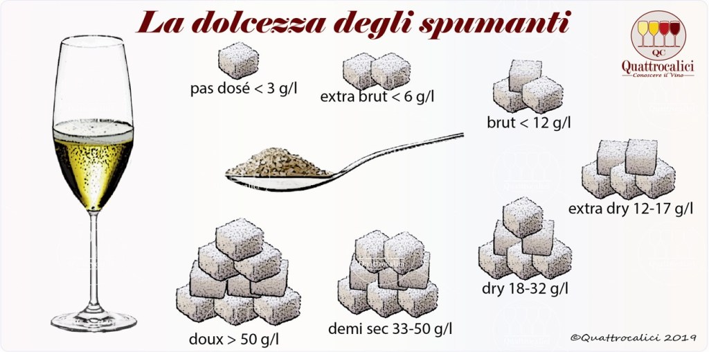 Un aneddoto interessante legato agli spumanti metodo classico è la possibilità di sciabolare le bottiglie, l’arte del sabrage in francese — io stessa mi sono resa protagonista di questa incredibile esperienza, non a caso, il giorno della mia laurea, a riprova del legame fra questo tipo di vini e le celebrazioni. È possibile infatti utilizzare uno strumento tagliente per stappare la bottiglia se la si colpisca parallelamente al punto in cui il collo è stato immerso nella soluzione refrigerante: a ridosso dello stesso, infatti, il vetro risulta essere più fragile e in un solo colpo è possibile aprire la bottiglia senza rimuovere il tappo. Per terminare l’articolato processo di spumantizzazione, si aggiunge la liqueur d’expédition, che in alcuni casi può essere lo stesso vino o una miscela di vino, zucchero e solitamente un altro ingrediente che rappresenta la ricetta segreta dell’azienda, a volte una goccia di distillato. La quantità di zucchero aggiunto determina la classificazione del vino in base al residuo zuccherino che va da pas dosé o brut nature, con aggiunta di zucchero inferiore a tre grammi per litro, passando per extra brut con un residuo zuccherino compreso tra zero e sei, brut da sei a dodici; sino ai più dolci extra dry con un quantitativo che va da dodici a diciassette, dry da diciassette a trentadue, demi-sec da trentadue a cinquanta, sino al dolce che presenta oltre cinquanta grammi per litro. A questo punto lo spumante è pronto per essere tappato con il tipico tappo a fungo, racchiuso nella gabbietta, necessaria a sigillarlo al vetro a causa della forte pressione.