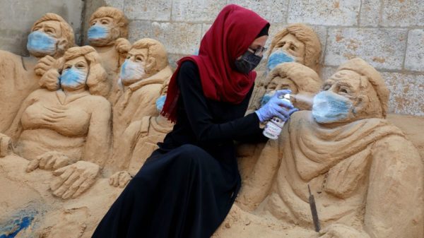 Un’altra giovane artista, questa volta palestinese, Rana Ramlawi (Gaza, 1996), si è impegnata nella campagna Stay at home. Lei lavora con la sabbia e ha raccontato in un’intervista che non ha potuto studiare, ma con determinazione è riuscita comunque a sviluppare il suo talento e a farsi conoscere: «I colori sono troppo costosi e spesso non si trovano, così ho iniziato a creare le sculture. La sabbia è il materiale che si trova in abbondanza nella striscia di Gaza, non finirà mai. Anche gli attrezzi che uso li costruisco da sola e li perfeziono in continuazione». Con le sue sculture racconta la sofferenza e la speranza del suo popolo. E tutto è cominciato con un grande dolore: suo fratello è stato gravemente ferito durante una manifestazione al confine. «Ho avuto paura di perderlo, il dolore mi squarciava il cuore». E solo con la sabbia, il pennello e i colori è riuscita a trovare pace.