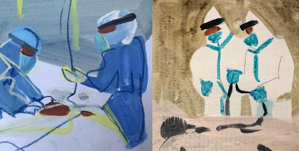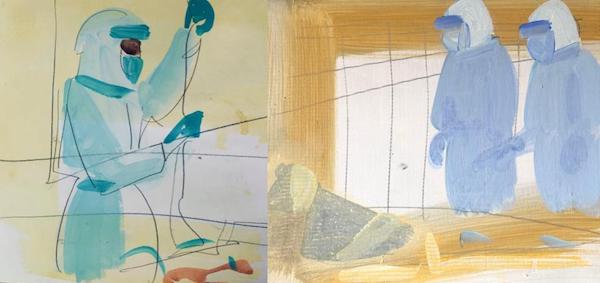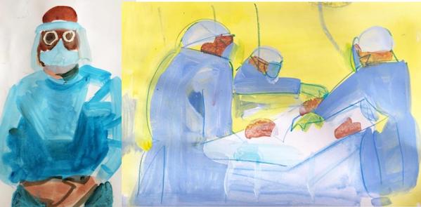 Susie Hamilton, nata nel 1950, è una pittrice britannica che vive e lavora a Londra. Le figure umane che dipinge sono appena abbozzate, macchie fluide che prendono vita grazie al suo abile pennello, ma proprio per questo ancora più espressive. L’artista negli ultimi tempi ha prodotto una serie di immagini di personale sanitario in camice, con visiera, cappucci e maschere che operano su pazienti affetti da coronavirus. Essendo impossibile accedere alle corsie ospedaliere, Peter Collins, uno dei suoi collezionisti, consulente epatologo e vicedirettore degli Ospedali universitari di Bristol e Weston, le ha fornito le foto del suo ospedale, da cui Susie ha tratto ispirazione, utilizzando anche filmati presi online e dalla televisione.