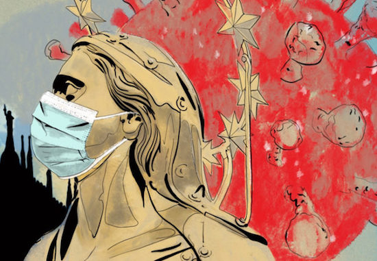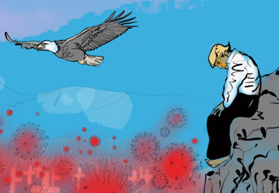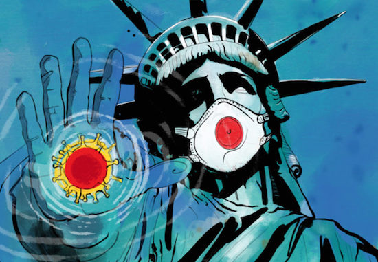 Antonella Martino, illustratrice di origini pugliesi che lavora a Roma, pubblica le sue opere su La Voce di New York, quotidiano online bilingue, rivolto alla comunità italiana presente negli Stati Uniti d’America. I suoi soggetti richiamano ovviamente l’ambiente degli States, e quindi La statua della Libertà, anche lei provvista di mascherina, allontana dalla città il pericolo del Covid; o il presidente americano Trump che ormai impotente guarda le croci di centinaia di migliaia di morti; o una visione nostalgica della Madonnina milanese, anche lei con mascherina e aureola a forma di covid, che guarda preoccupata verso New York, simboleggiata dalla statua della Libertà.