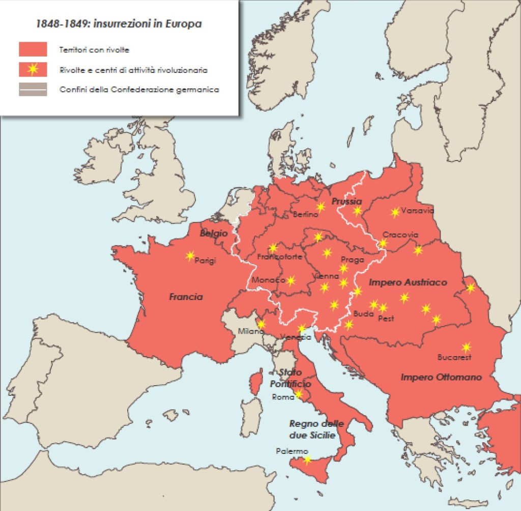 Nel biennio 1848-49 movimenti insurrezionali, che gli storici hanno definito “Primavera dei popoli”, scoppiano in molti paesi e città europee. Le parole d’ordine degli insorti sono: Costituzione, giustizia sociale e, nei paesi sottoposti a dominazione straniera come l’Italia, indipendenza. Il movimento fu talmente vasto e lo sconvolgimento tanto profondo che ancora oggi si dice “è successo un quarantotto” per indicare una situazione di totale disordine e sovvertimento.