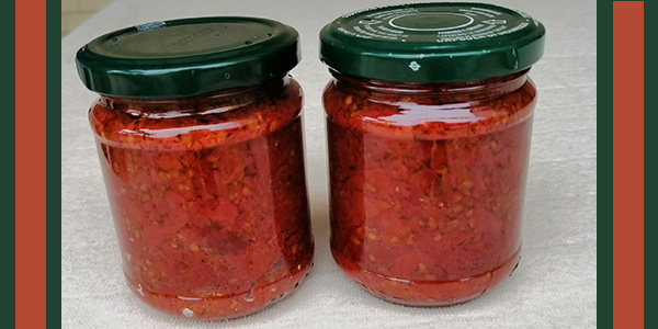 A questo punto mettere nei vasetti sterilizzati pressando bene in modo che non ci siano bolle d’aria, il tutto deve risultare coperto di olio naturalmente extravergine di oliva. Per sicurezza ulteriore io conservo i vasetti in frigorifero ma non sarebbe necessario.