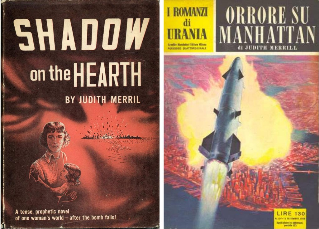 Nel 1950 Judith partorisce la seconda figlia e dà alle stampe Shadow on the Hearth (Ombra sul focolare, con gioco di parole tra ‘Hearth’ ed ‘Earth’, Terra), tradotto in italiano con il titolo Orrore su Manhattan per il n. 134 dei Romanzi di Urania, in edicola il 13 settembre 1956. «Il nostro focolare è minacciato. Non lo ignoriamo» scrive Giorgio Monicelli nella presentazione del romanzo, che ha tutte le caratteristiche della prosa di Merril: personaggi in numero limitato, con grande attenzione al profilo psicologico, azione contenuta, sviluppi lenti, gesti quotidiani e rapporti familiari, che rendono l’opera perfettamente adattabile alla dimensione teatrale; in effetti, quattro anni dopo, Shadow on the Hearth diviene lo sceneggiato Atomic Attack (regia di Ralph Nelson, tra i protagonisti Walter Matthau), trasmesso il 18 maggio 1954 da ABC nell’ambito della serie ‘Motorola Television Hour’.