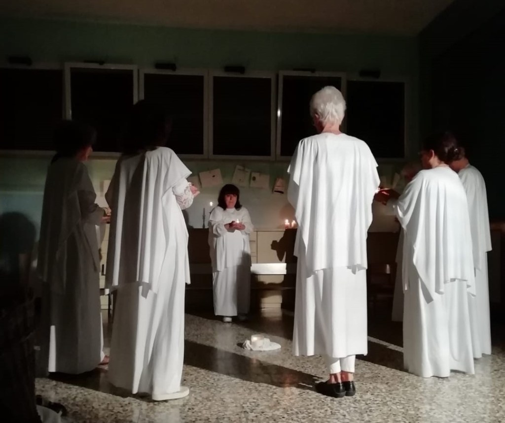 Ma improvvisamente dovetti partire; fu quando la mamma mi trovò un lavoro, poiché mio padre si era ammalato e spettava a me mantenere la famiglia. Prima a Chiari, per 4 anni… poi a Capriate S. Gervasio per 8 anni, dove la signora padrona, la contessa, mi opprimeva, mi toglieva la libertà di scrivere delle lettere, potevo farlo solo di notte. Ma ecco, improvviso e inaspettato, il mio sogno si realizzò: conobbi don Francesco, che gioia! Condividemmo il desiderio di adorazione del SS Sacramento e cercammo un luogo per dar vita a questo proposito. Lo trovammo in Bergamo e, il 15 dicembre 1882, con una sorella e un’amica, Vincenza Novali, si parte finalmente ed è per sempre! Facemmo ingresso nella casa e fondammo l’istituto. Il mio cuore era colmo di gioia. Lasciai finalmente gli abiti civili, assunsi il nome di Geltrude del Santissimo Sacramento, nome che significa amica della lancia. Geltrude, di cui ricorre la festa il 16 novembre, è una Santa che fu monaca tedesca cistercense, a cui guardo da molto tempo, viene oggi in mio aiuto e sostegno. Voglio recitare il Magnificat, il canto di lode che Maria recita quando va a trovare Elisabetta… Magníficat ánima mea Dóminum, et exsultávit spíritus meus in Deo salvatóre meo».