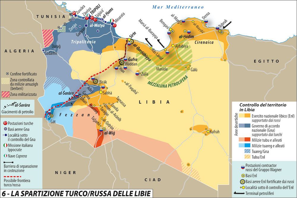 Ma è la seconda parte che merita di essere approfondita per dilatare lo sguardo su quella che la rivista chiama Caoslandia. Di due Libie parla il bell’articolo di Gianandrea Gaiani, ovvero la spartizione russo-turca delle Libie, delle mire di Israele su Cipro e Grecia Orna Mizrahi, della presenza nel Mediterraneo delle petromonarchie Cinzia Bianco. Sulle mire dell’Egitto in Libia scrive Costanza Spocci nel suo bell’articolo Sirte è la linea purpurea del Cairo, con interessanti informazioni sulle importazioni di armi da parte del Paese che ancora non fa luce sul caso Regeni, che viola sistematicamente i diritti umani e che è il terzo importatore di armi al mondo, anche dall’Italia. Paese definito da un analista «economia capitalista militare 3.0». La scoperta del megagiacimento di Zohr nel Mediterraneo, di cui Eni detiene una quota del 50%, potrebbe essere una delle cause della vendita di armamenti italiani. «Ciò deriverebbe anche dalla necessità di proteggere il forziere marittimo di idrocarburi in un bacino oggetto delle crescenti mire di Turchia, Israele, Grecia ed Emirati, fra gli altri». Tiziana della Ragione affronta la posizione dell’Algeria, prossima allo Stretto di Gibilterra, che ha esteso la sua Zee fino ad Oristano e si pone oggi come la maggior potenza militare del Nordafrica, con pericolose mire espansionistiche e un’alleanza con Mosca e con la Cina da non sottovalutare. Agnes Levallois ci parla della Francia e dello scontro su più fronti con la Turchia. Chiara Lovotti con Arturo Varvelli scrivono di Mosca in Cirenaica e del gruppo Wagner, formazione paramilitare di mercenari che forse sotto mentite spoglie rappresenta proprio un braccio armato del Ministero della Difesa russa. Molto interessanti la conversazione di Caracciolo con Lapo Pistelli di Eni, l’articolo di Germano Dottori su Londra e il Mediterraneo, quello su Malta di Lorenzo Noto e infine quello dal taglio storico di Pietro Figuera sul fascino del mare nostrum per la Russia.