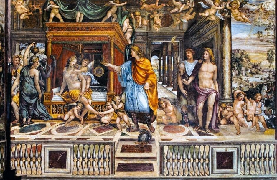 Il condottiero macedone è il cardine della scena, è lui che porge la corona d’oro alla donna coperta solo di veli trasparenti e seduta sul bordo di un letto a baldacchino. Rossane riceve il simbolo del potere regale da Alessandro, così come l’immortalità divina viene concessa a Psiche grazie alla presenza e all’intervento di Amore tra le divinità dell’Olimpo. Come non pensare al potente Agostino che “magnanimamente” ha “tramutato” la cortigiana Francesca nella ricca signora della villa sulle sponde del Tevere?