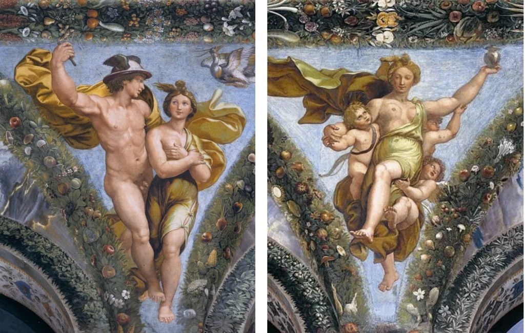 In dieci pennacchi della Loggia, Raffaello e i suoi collaboratori avevano raccontato altrettanti episodi della favola di Apuleio Amore e Psiche, storia di un amore contrastato, messo alla prova più volte ma giunto alla lieta conclusione delle nozze. Se nella figura del dio Amore si celava metaforicamente Agostino, la bionda e armoniosa figura di Psiche voleva alludere a Francesca che, come la protagonista della storia, aveva dovuto superare numerosi ostacoli negli anni della sua vita romana, dall’avversione della famiglia Chigi alle tante maldicenze e alla disapprovazione generale. Committente e artista vollero che il tema centrale degli affreschi fosse il matrimonio, narrato all’interno di due finti arazzi distesi sulla volta come fossero le coperture di un gazebo. Dentro cornici vegetali Raffaello e i suoi allievi dipinsero le fasi conclusive del racconto di Apuleio, Il concilio degli Dei e Le nozze di Amore e Psiche, momento in cui Psiche, ascesa all’Olimpo e divenuta immortale, si unisce per l’eternità ad Amore.