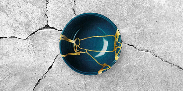 Il termine Kintsugi indica un’antica filosofia e arte giapponese di riparazione degli oggetti in ceramica che hanno subito una rottura, il cui significato letterale è “riparare con l’oro”; i frammenti sono solo uniti mettendo in rilievo le crepe con polvere d’oro.