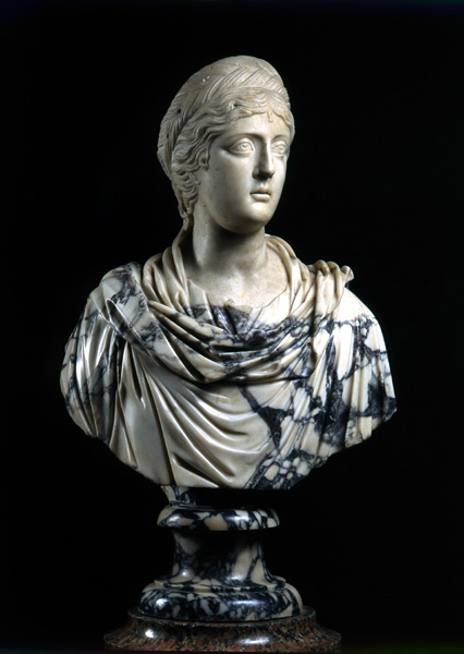 Iniziamo il percorso attraverso i volti femminili scolpiti partendo dal celebre Appartamento dei Conservatori (sito nel Palazzo dei Conservatori, cui si accede direttamente da Piazza del Campidoglio), noto per le stanze affrescate tuttora utilizzate per alcuni eventi di rappresentanza. Nella ‘sala dei Capitani’ viene custodito un primo esempio di ritratto femminile di epoca antica. È una scultura di marmo pavonazzetto, databile al 390 d.C. circa: si tratta di una donna di origine patrizia, abbigliata secondo l’uso del tempo e con i capelli incorniciati da una treccia. Il busto risulta essere serio e composto, secondo i canoni tradizionali della ritrattistica istituzionale.