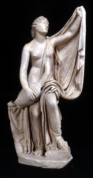 Salendo al secondo piano del Palazzo Nuovo si arriva alla ‘Galleria’, area che espone molte sculture di varia epoca e stile. Prima tra tutti è da segnalare una interessante Testa di divinità femminile di epoca ellenistica. La divinità, che non è stato possibile identificare, presenta i capelli raccolti e gli occhi cavi, sulla scia della tradizione che prevedeva che gli occhi delle divinità fossero impreziositi da metalli e pietre preziose. Colpisce inoltre la Statua di Leda con cigno che raffigura a tutto tondo il mito, mentre la donna viene sedotta da Zeus sottoforma di cigno. La scultura risulta essere molto più dinamica rispetto alle opere precedentemente incontrate e con delle linee di forza e movimento ben evidenti. L’opera è infatti copia romana della celebre scultura di Timotheos, artista di epoca ellenistica.