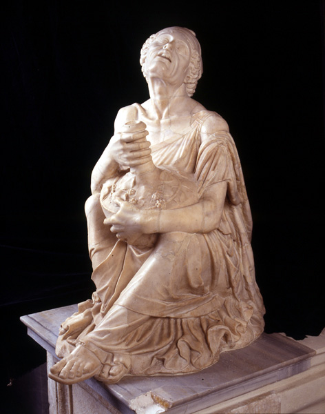 Copia romana da un originale ellenistico (forse dello scultore Mirone di Tebe) è anche la marmorea Statua di vecchia ebbra. L’opera rappresenta una donna anziana con il viso rugoso e contorto, visibilmente ubriaca, mentre tiene un otre di vino in mano. Risulta evidente quanto l’arte ellenistica si sia allontanata sotto alcuni aspetti dall’arte classica. La raffigurazione dell’anziana infatti testimonia un’attenzione maggiore verso l’emozionalità e l’introspezione psicologica e una presa di distanza parziale dai canoni perfetti ed imperturbabili dell’arte classica del IV e V secolo a. C.