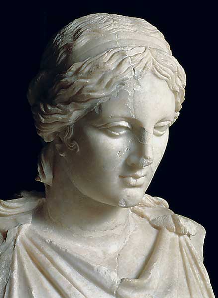 Le prime figure femminili che si possono incontrare sono delle composizioni scultoree nell’Atrio. Subito cattura l’attenzione una colossale Statua di Minerva di oltre tre metri d’altezza, databile al II sec. a.C. La figura in marmo è scolpita secondo i canoni iconografici tradizionali che contraddistinguono la dea della sapienza. Il suo viso è coperto dall’elmo e le cavità oculari sono vuote, perché in origine erano colmate da pietre dure e metallo. Con ogni probabilità la scultura si ispira direttamente alla celebre statua crisoelefantina che Fidia realizzò per il tempio ateniese della dea nella metà del V secolo a.C.