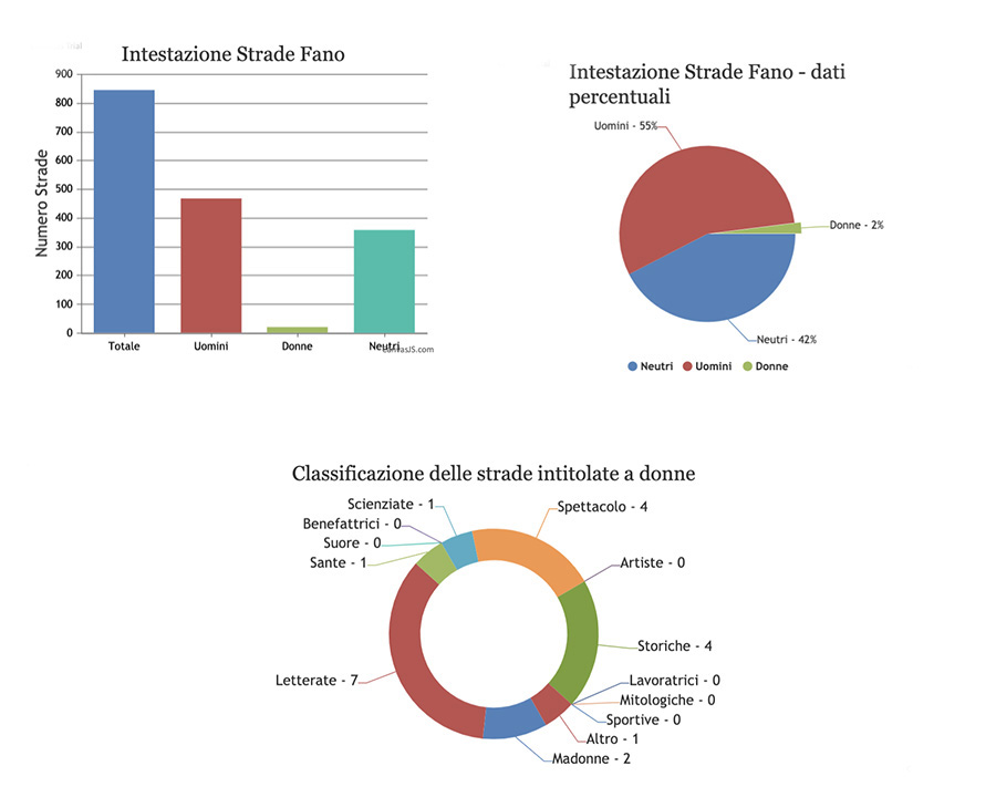 Nei molti decenni di storia della toponomastica e odonomastica fanesi analizzati da Maria Grazia Battistoni e Anna Tonelli, le Commissioni di toponomastica istituite dalle amministrazioni comunali hanno avuto solo componenti maschili. Nel 1988, anno in cui furono candidate al ruolo anche tre donne, nessuna di loro venne eletta. «Il Consiglio comunale, prevalentemente maschile, scelse ancora una volta solo uomini in qualità di esperti, di fatto non riconoscendo che le donne potessero essere all’altezza di un compito fino ad allora svolto da figure maschili». E le Commissioni toponomastiche di soli uomini non hanno posto alcuna attenzione alle tante assenze di nomi femminili tra le vie cittadine.
