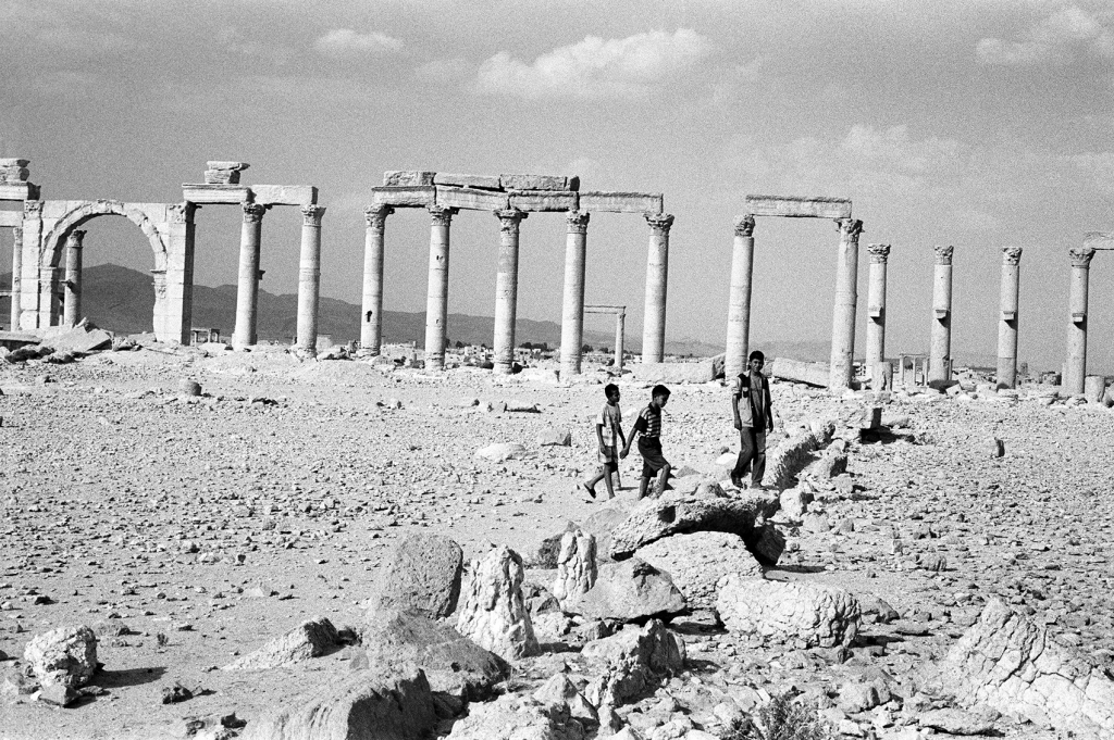 Dei bambini giocano tra le rovine dei templi di Palmira, antica colonia romana. Qui le figure umane, accostate alle dimensioni delle colonne o all’intensità della luce, interagiscono poco con il paesaggio, sembrano formiche, ombre nere in un deserto, microscopiche rispetto a ciò che le circonda, come a mostrare la piccolezza umana rispetto all’infinita grandezza di Allah.