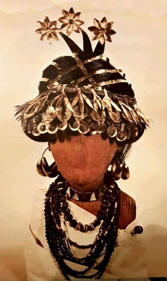 Le donne hanno gli occhi pesantemente cerchiati di nero con polvere di antimonio e le sopracciglia che si uniscono al centro; amano indossare lunghe vesti arricchite da balze e volant. La tiara con più corna indica l’appartenenza alla divinità.