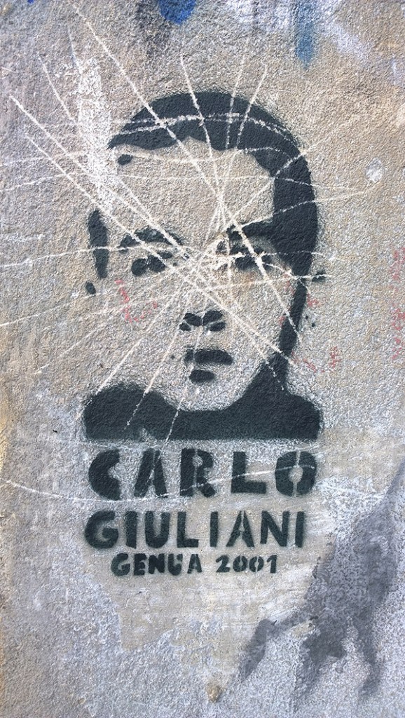 Nel frattempo le generalità della vittima sono state rese note da Bruno Vespa in televisione, insieme a diverse bugie sul suo conto. Si chiamava Carlo Giuliani, era genovese, aveva 23 anni e un’indole decisamente pacifica, non era solito andare alle manifestazioni né partecipare agli scontri, ma queste informazioni verranno per sempre taciute. Carlo quella mattina stava andando al mare, ma si è ritrovato in un contesto di follia e arbitraria violenza in divisa: ha assistito alle cariche di piazza Manin, poi è sceso a Marassi e ha attraversato il tunnel sotto la ferrovia che conduce in via Tolemaide, ed è nel tunnel che ha raccolto il rotolo di scotch che porterà infilato al braccio nel pomeriggio. Davanti alla ferocia dei carabinieri in via Tolemaide, Carlo ha rinunciato ad andare al mare e ha iniziato ad aiutare i manifestanti, una foto lo ritrae all’incrocio tra va Tolemaide e corso Torino intento a trascinare un cassonetto della rumenta per costruire una barricata. Rimane nel corteo fino all’imboscata che lo ucciderà.